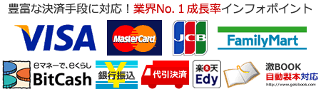 VISA、MASTER、JCB)、銀行振込、代金引換、 コンビニ決済、BitCash、Edy